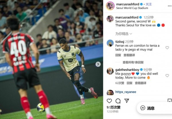 拉什福德社媒:第二场比赛&第二场得胜,感谢首尔的热心扶直!