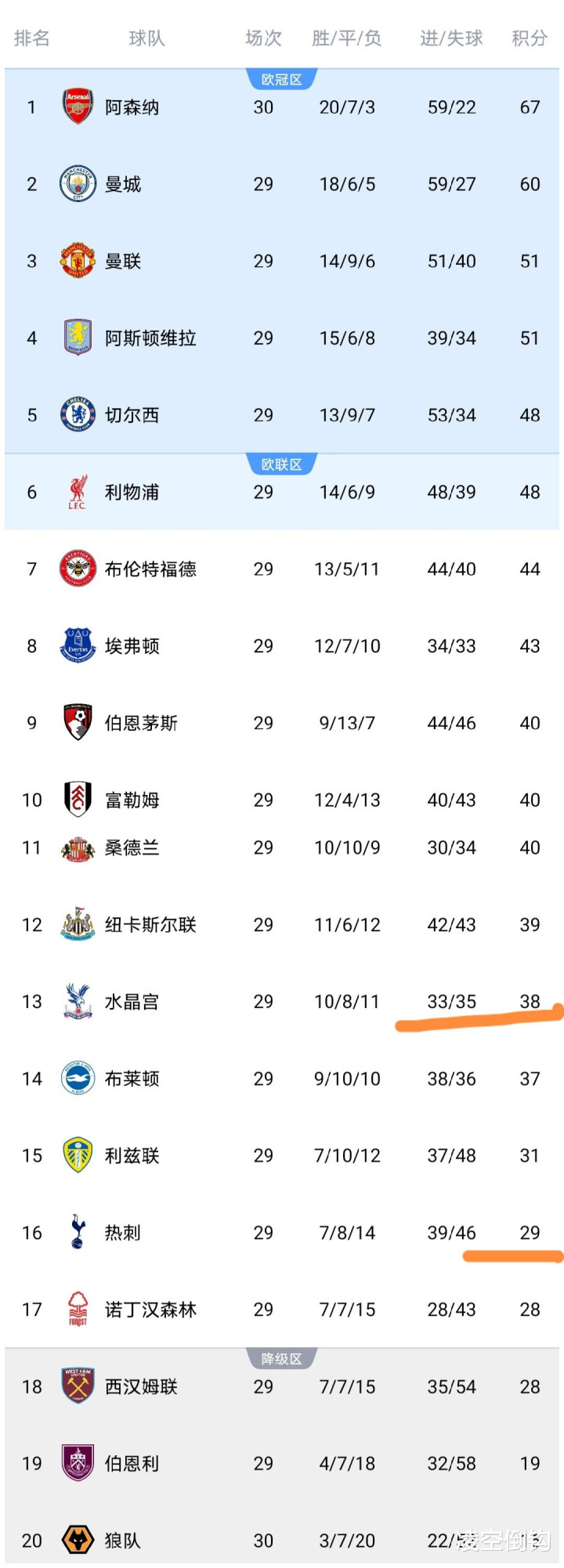 可以看到热刺遭水晶宫反转 之后,积分停留在了29分,仅比降级区多1分,热刺保级形势严峻啊,可以说热刺本赛季剩余的赛事 都要为保级而战,而且不能有半点的马虎,利兹联、热刺、诺丁汉森林、西汉姆联争一个保级名额。热刺沦为保级球队,令人唏嘘啊。而水晶宫队赛后的积分上涨到了38分,水晶宫队基本保级无忧了。