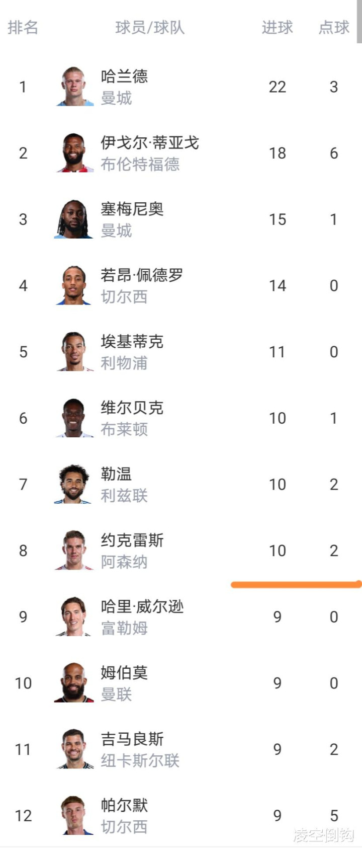 射手榜包括佩德罗、维尔贝克在内8人得分 上双,但是仅哈兰德一人得分 超过了20个。