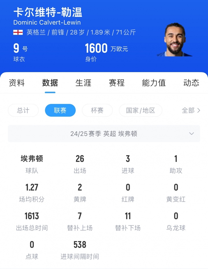 28岁的勒温司职中锋,上赛季为埃弗顿各项赛事26场孝敬3球1助攻,还是公约到期摆脱身离队,现时德回身价1600万欧元。