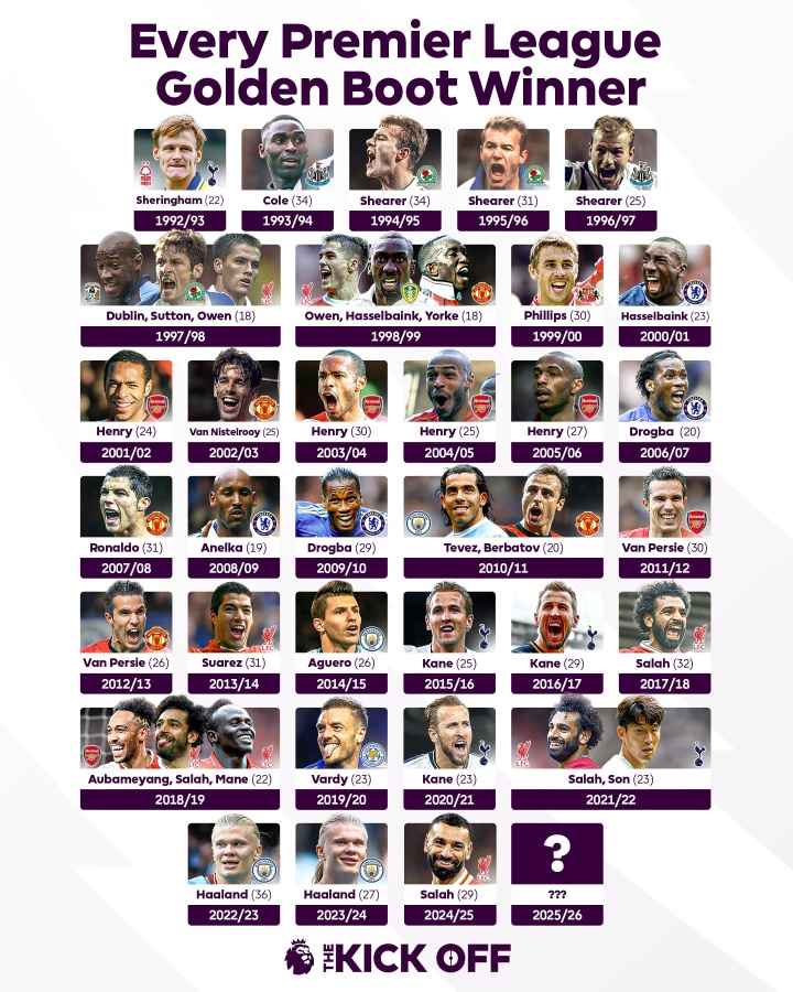 英超官推晒积年英超金靴得主:萨拉赫本赛季能否卫冕金靴?