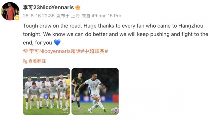 客场战平,效果心事。诚意感谢今晚来到杭州的每一位球迷。咱们知说念咱们不错作念得更好,咱们将持续拼搏,为你们接触到终末一刻。