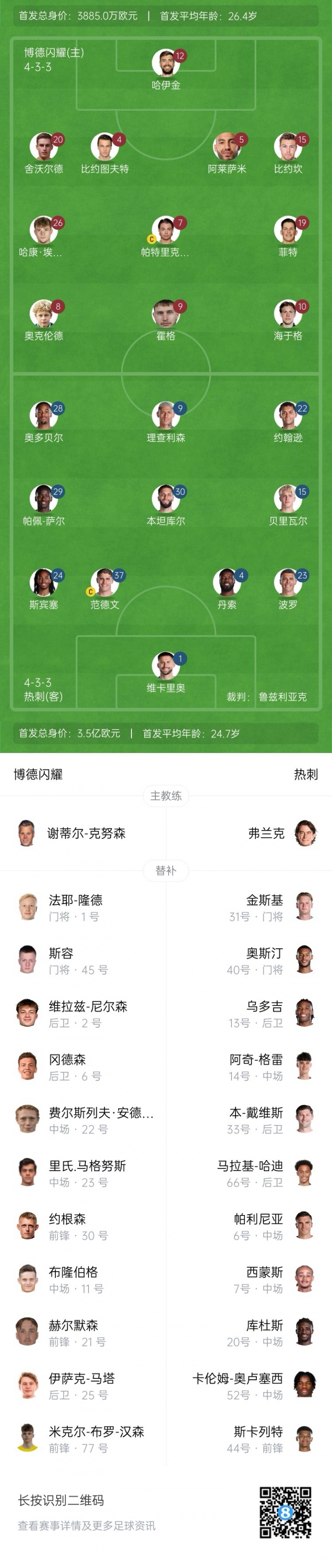 博德醒目首发:12-哈伊金、20-舍沃尔德、4-比约夫图特、5-阿莱萨米、15-比约坎、26-哈康·埃文森、7-帕利特克-伯格、19-菲特、8-奥克伦德、9-霍格、10-海于格