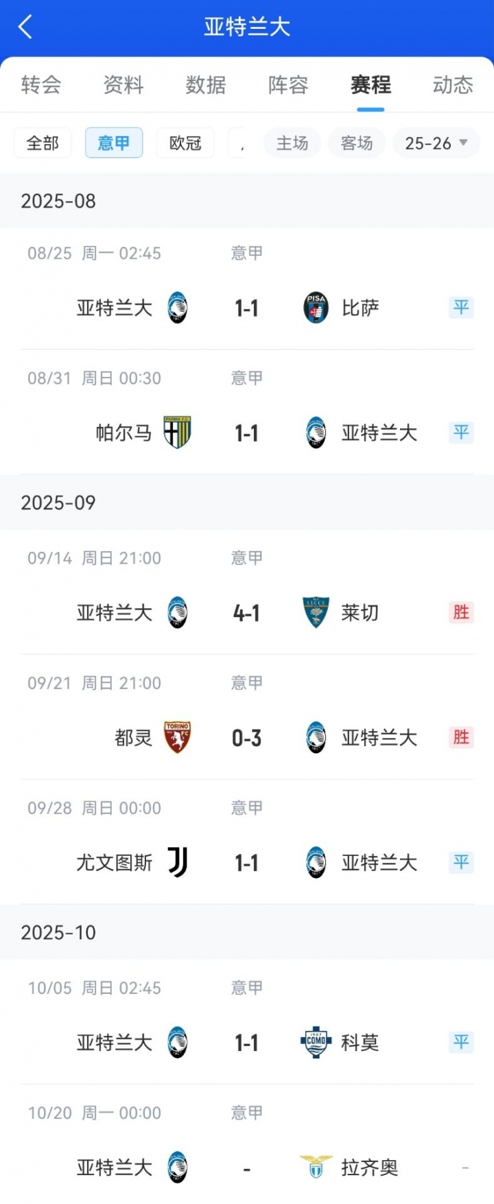 至此,意甲仅剩一支球队仍保握不败:开赛以来2胜4平,积10分名次联赛第7的亚特兰大。当天凌晨0点,他们将镇守主场迎战拉王人奥。