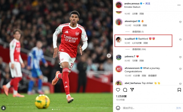 【小拉什福德】萨利巴在阿森纳17岁小将安努斯庆祝成效的帖子下评述:“拉什福德😍😍”