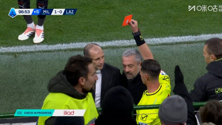 米兰vs拉皆奥补时第95分钟,裁判介入看VAR,查验帕夫洛维奇手球!阿莱格里怒了!被出示红牌!