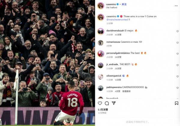传射立功!卡塞米罗社媒晒心理滑跪庆祝照:3连胜!曼联加油!