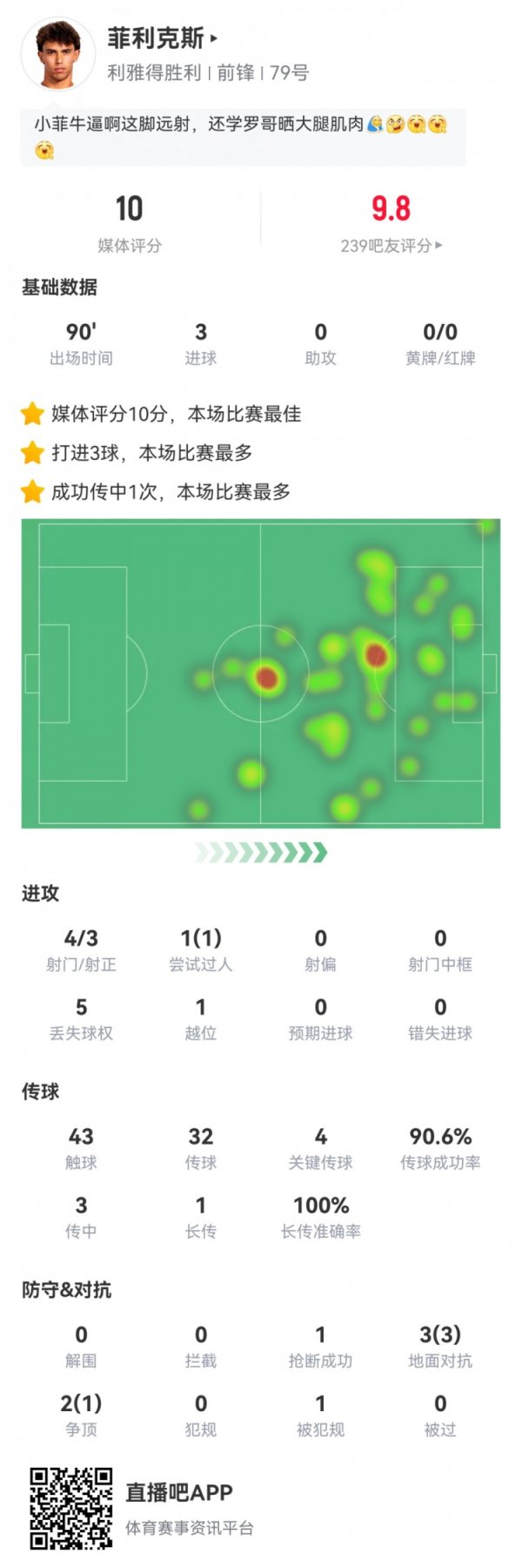 戴帽!菲利克斯数据:4射3正3进球,4次重要传球,获评10分满分