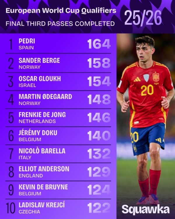 内行!佩德里欧洲世初赛蹙迫三区得胜传球164次,参赛球员中最多