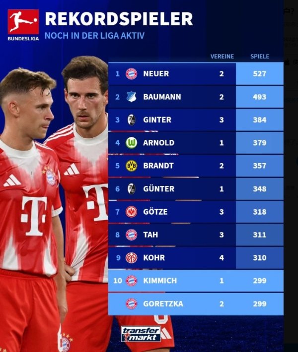 德甲现役球员出场数排名:诺伊尔527场居首,基米希、磁卡进前10