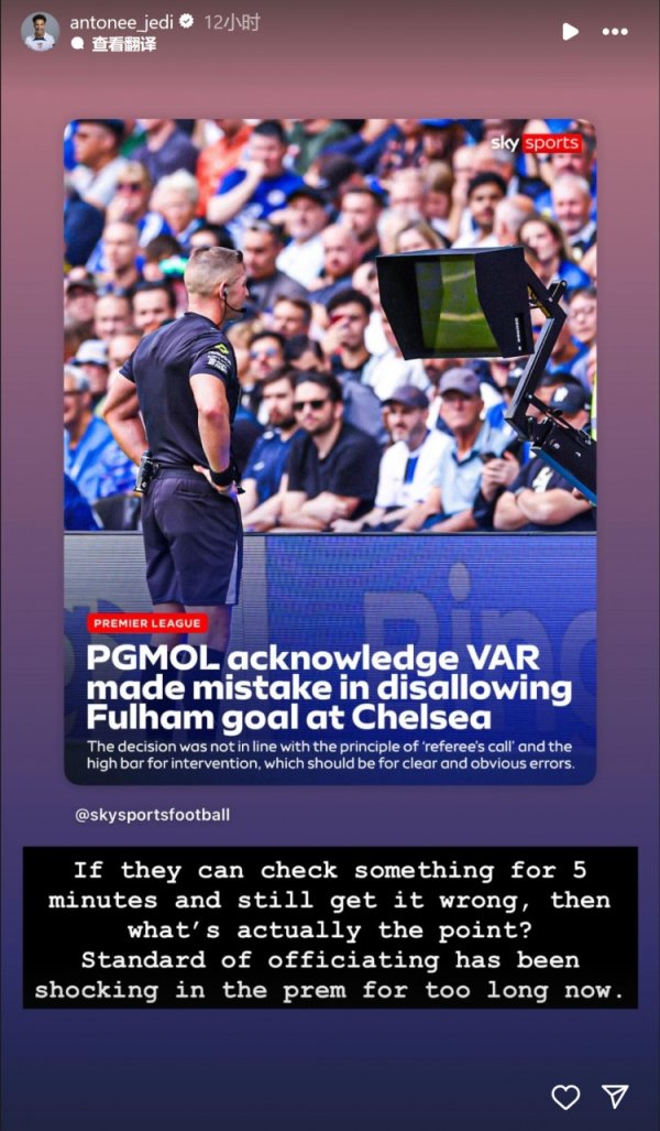 富勒姆球员罗宾逊:看5分钟回放也曾判错了,英超裁判水平很恶运