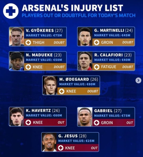 德转列阿森纳伤病名单:加布里埃尔等3东谈主伤缺,约克雷斯等5将存疑