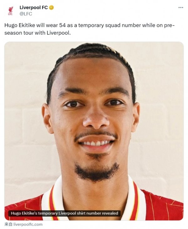利物浦官方:埃基蒂克将在季前赛身穿54号,行动临时球衣号码