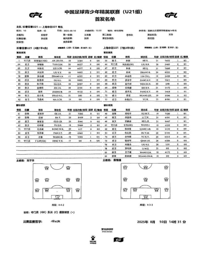 8月10日15:30 ,2025中国足球青少年精英联赛(U21组)重燃战火,第10轮上海申花对阵长春亚泰的比赛在呼和浩特国度朔方足球旁观基地进行。第63 分钟,王子衡边路传中,黄征禁区内摆渡,庞开元门前抢点到手打入全场惟一入球。最终上海申花1-0顺利。8月12日15:30,申花将不竭迎战第11轮敌手青岛西海岸。
