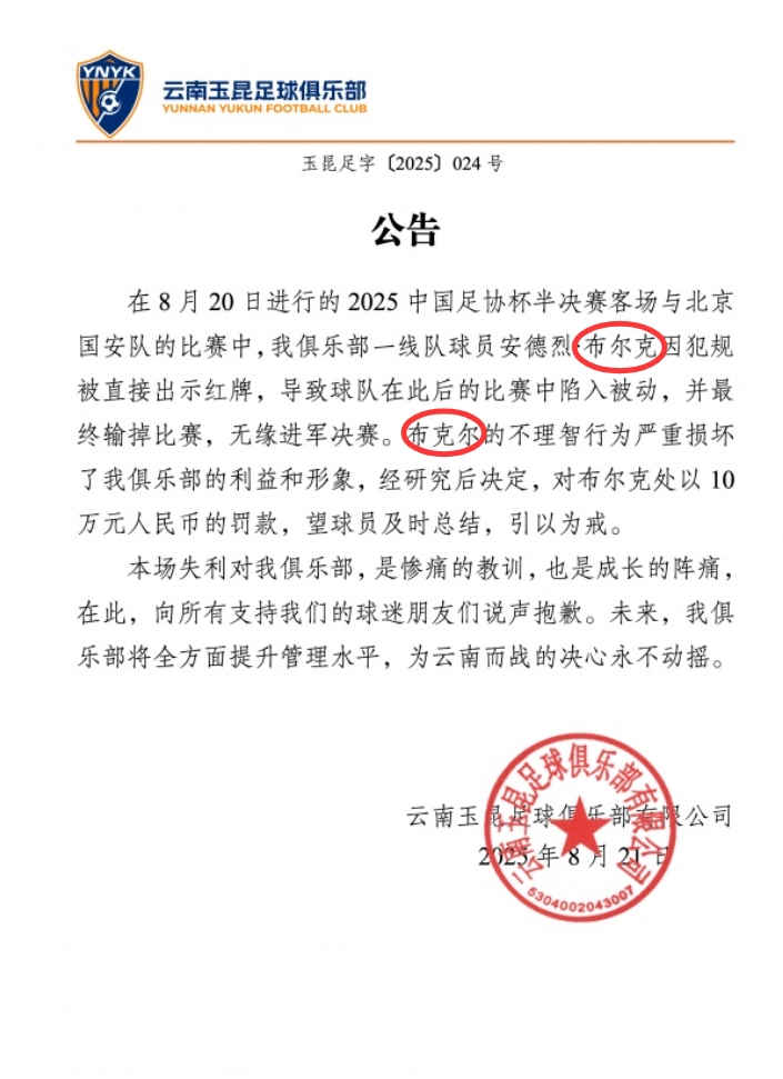 罚金10万!玉昆公告中将布尔克错打成布克尔,随后官博将微博删除