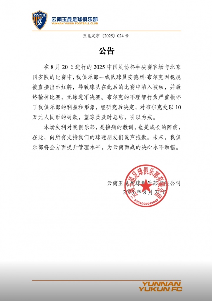08月21日讯 云南玉昆0-7惨溃逃京国安,无缘足协杯决赛。赛后玉昆官方开出罚单,对吃到直红的外助布尔克罚金10万元。