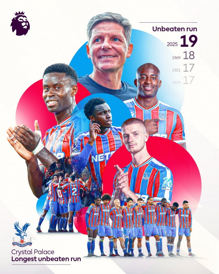 水晶宫各赛事19场不败,创造队史最长不败记载。