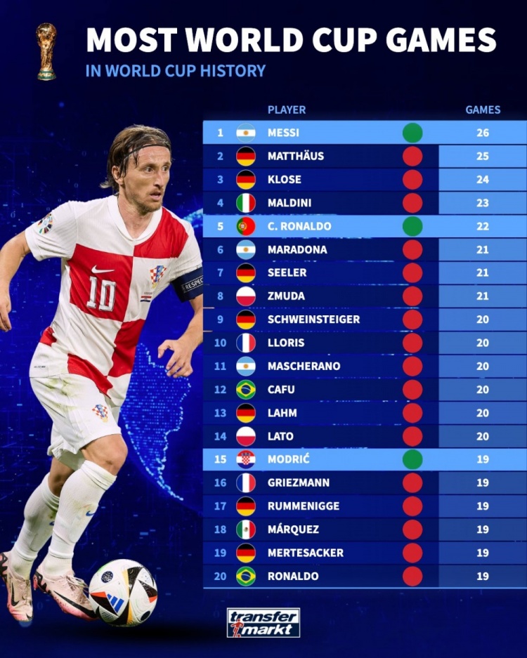 11月15日讯 克罗地亚得到寰球杯参赛资历,莫德里奇将迎来第5届寰球杯,德国转会市集统计了球员活着界杯的出场次数,并排出榜单,梅西26场居首,C罗22场、莫德里奇19场。