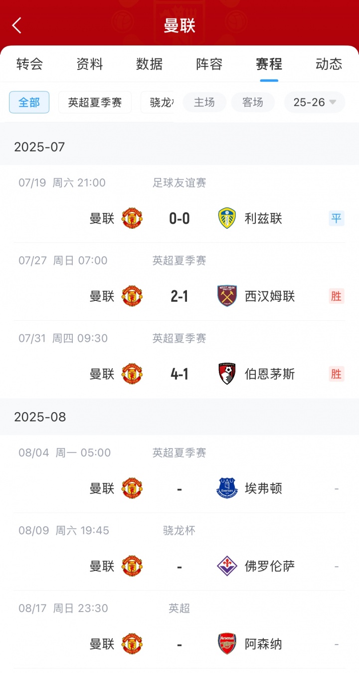 曼联8月还有两场季前热身赛,区别对阵埃弗顿、佛罗伦萨。随后新赛季英超将打响,曼联首轮对阵阿森纳。