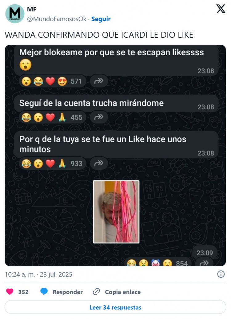 旺达:“他赓续用假账号存眷我,因为不久前你的账号给我点了一个赞。”数百万粉丝飞快考证了这一事件,并截取了更多截图。果如其言,在这一切传播开来后不久,阿根廷东说念主就取消了点赞。