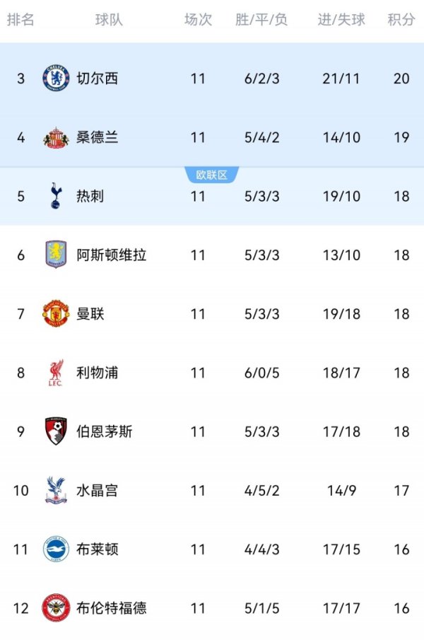 中游大乱斗!英超第3-12名仅差4分,热刺曼联利物浦等5队积18分