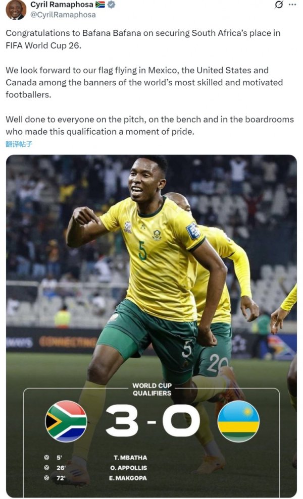 南非总统社媒:祝贺国度队晋级宇宙杯,期待国旗在好意思加墨赛场飘零