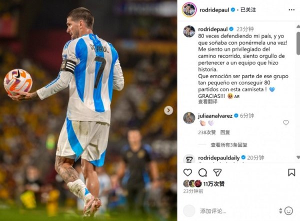 9月10日讯 在本轮南好意思世初赛,阿根廷0-1不敌厄瓜多尔,德保罗完成国度队生计80次出场里程碑。 赛后德保罗也在个东说念主社媒晒照,配文写说念:“为国度队第80次出战,这是我一经梦思作念到的。我为我方的国度队生计感到运气,也为好像成为这支创造历史球队的一员而骄贵。身披这身球衣80次出场着实令东说念主感到欢叫,谢谢你阿根廷!”......查看更多