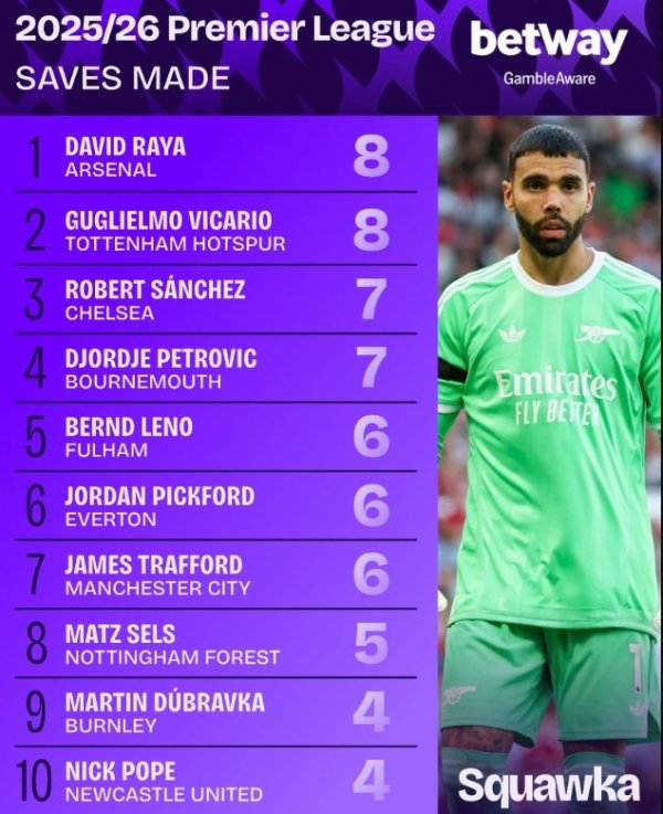 拉亚、维卡里奥8次比肩本赛季英超扑救榜榜首,且两东说念主还未丢球