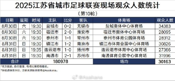 苏超第10轮不雅世东说念主数:盐城主场34383东说念主居首,场均30163东说念主