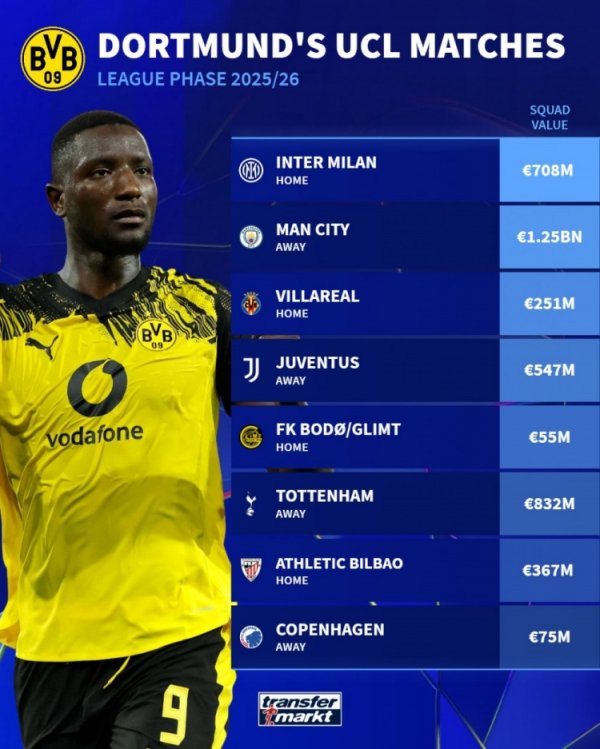 多特欧冠敌手身价:曼城12.5亿欧最高,热刺8.32亿&国米7.08亿