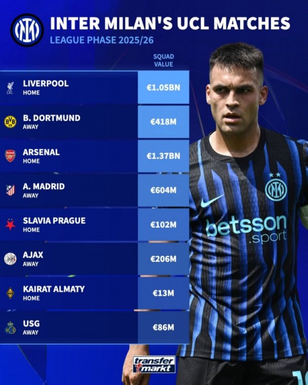 国米欧冠敌手身价:阿森纳13.7亿欧最高,利物浦10.5亿欧次席