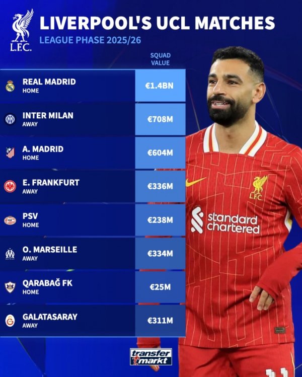 利物浦欧冠敌手身价:皇马14亿欧最高,国米7.08亿&马竞6.04亿