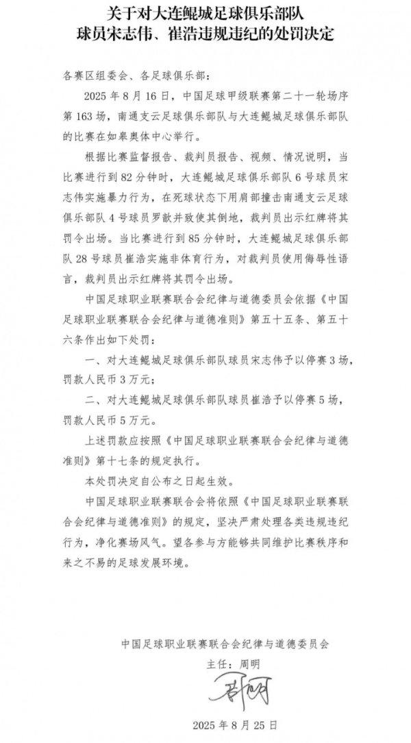 08月25日讯 中甲第21轮,南通支云镇守主场2-0打败大连鲲城,鲲城本场比赛3东谈主染红。 中足联发布罚单,对大连鲲城球员宋志伟和崔浩进行了处分,其中宋志伟停3场罚3万,崔浩停5场罚5万。 比赛第84分钟,两边爆发突破,宋志伟因暴力看成被直红罚下!↓ 比赛第86分钟,崔浩对主裁判出言不逊,主裁判出示红牌平直罚下!↓ 此外,在广西平果与定南赣联的比赛中,定南赣联王念念寒犯规后有踩踏看成被出示红牌,他被处分停3场罚3万。广西平果球员樊超相似因暴力行动停3场罚3万。 王念念寒犯规......查看更多